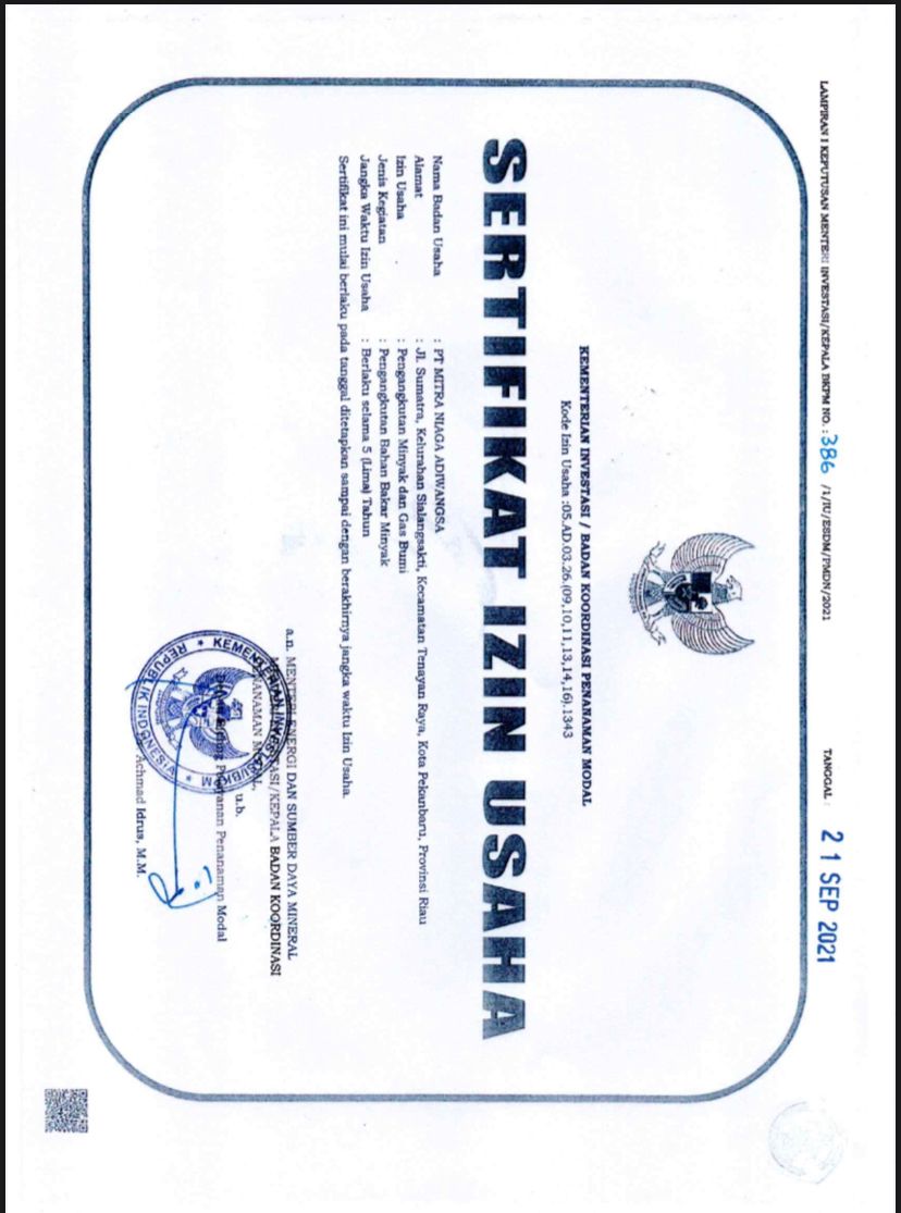 PT.Mitra Niaga Adiwangsa adalah perusahaan yang bergerak dibidang Pengangkutan Minyak dan Gas Bumi dengan Kode Izin Usaha :05.AD.03.26 (09,10,11,13,14,16).1343